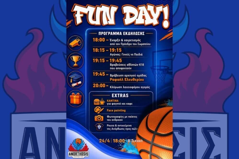 Η Ανόρθωση Αμμοχώστου Καλαθόσφαιρα διοργανώνει ένα ξεχωριστό “Fun Day”, με στόχο την οικονομική ενίσχυση των ακαδημιών της ομάδας, προσκαλώντας μικρούς και μεγάλους σε μια ημέρα γεμάτη αθλητισμό, ψυχαγωγία και κοινωνική προσφορά.
