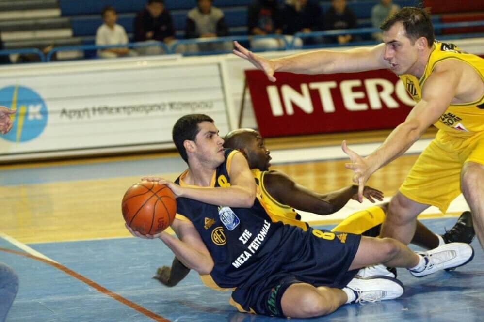 Πρόκειται για τους Μιχάλη Κουνούνη, που προσπαθεί να δώσει κάπου τη μπάλα και ενώ ο Γιώργος Καραμπατάκης προσπαθεί να την αρπάξει!